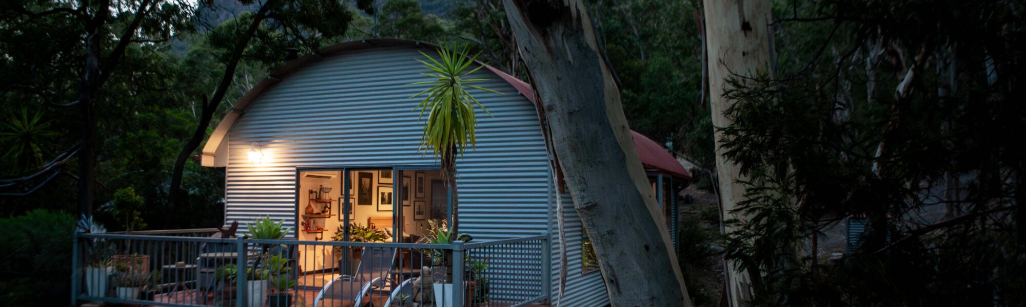Nestled in native bushland, Heavenly Escape is a modern, creatively decorated, award winning, studio-style couples retreat. Tranquil, secluded, yet only 1km walk from the bustling heart of the Grampians, Halls Gap. Escape is fully self-contained and boasts a spa, cosy wood fire, tree-surrounded deck, a fully appointed kitchen, and a spectacular back drop of the Grampians National Park.